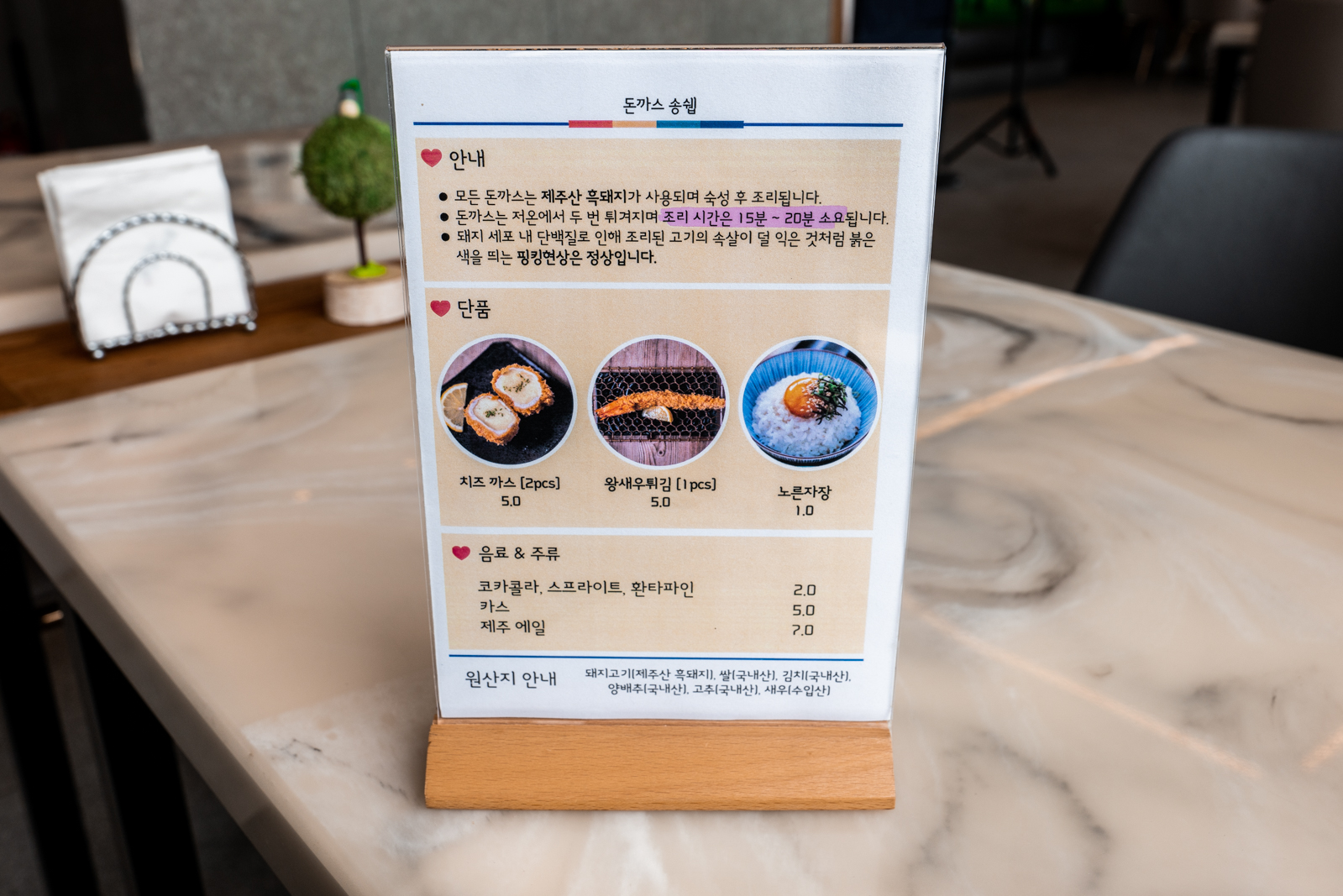 제주 함덕 맛집 돈까스송쉡은 지난 2021년 5월에 오픈한 곳으로 매일 새기름을 사용하여 수제로 돈까스를 만든다. 키즈존이며 포장, 배달도 가능해 제주 함덕 호텔, 숙소에 머무르는 분들이라면 점심, 저녁식사 메뉴로 선택하기 좋다.