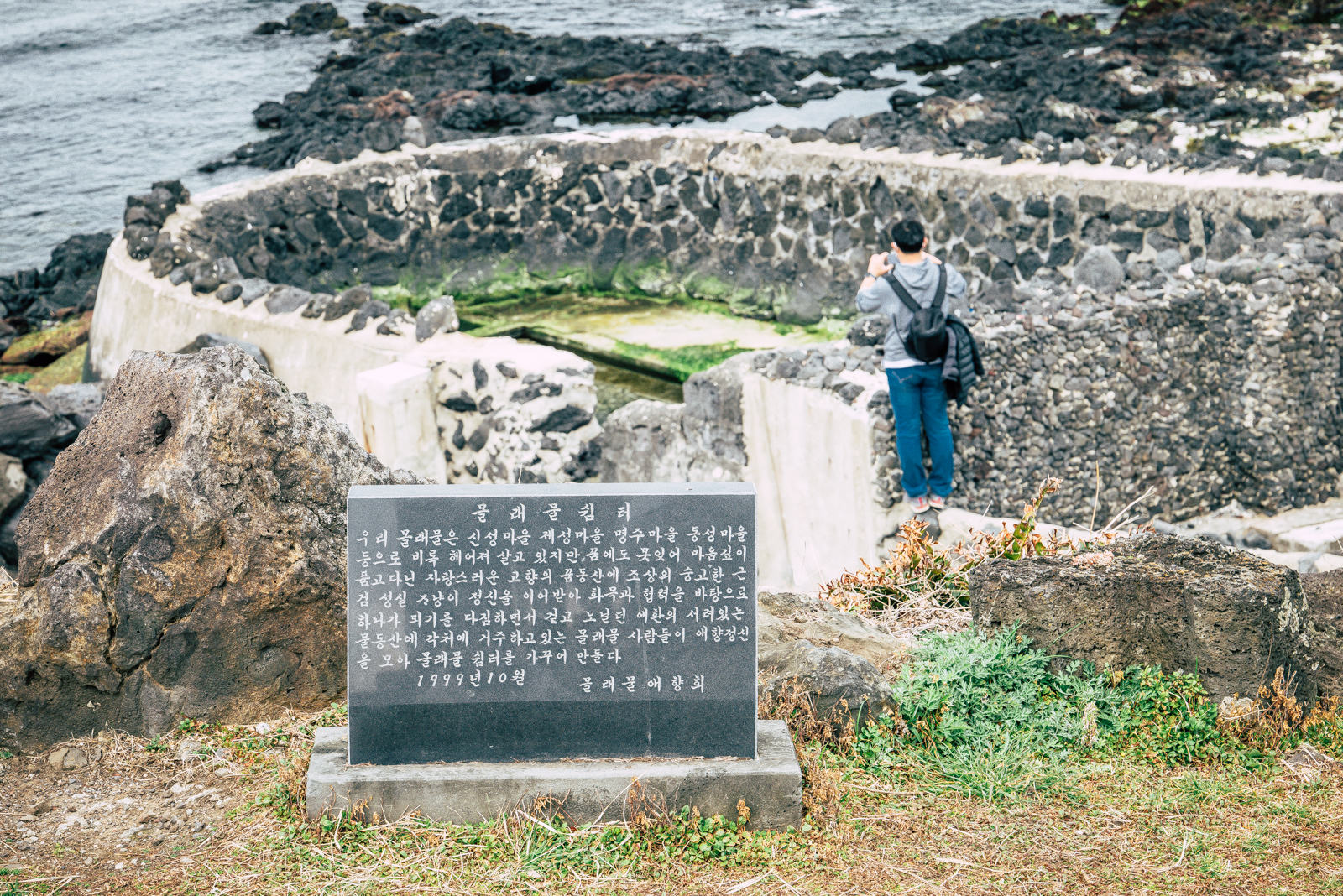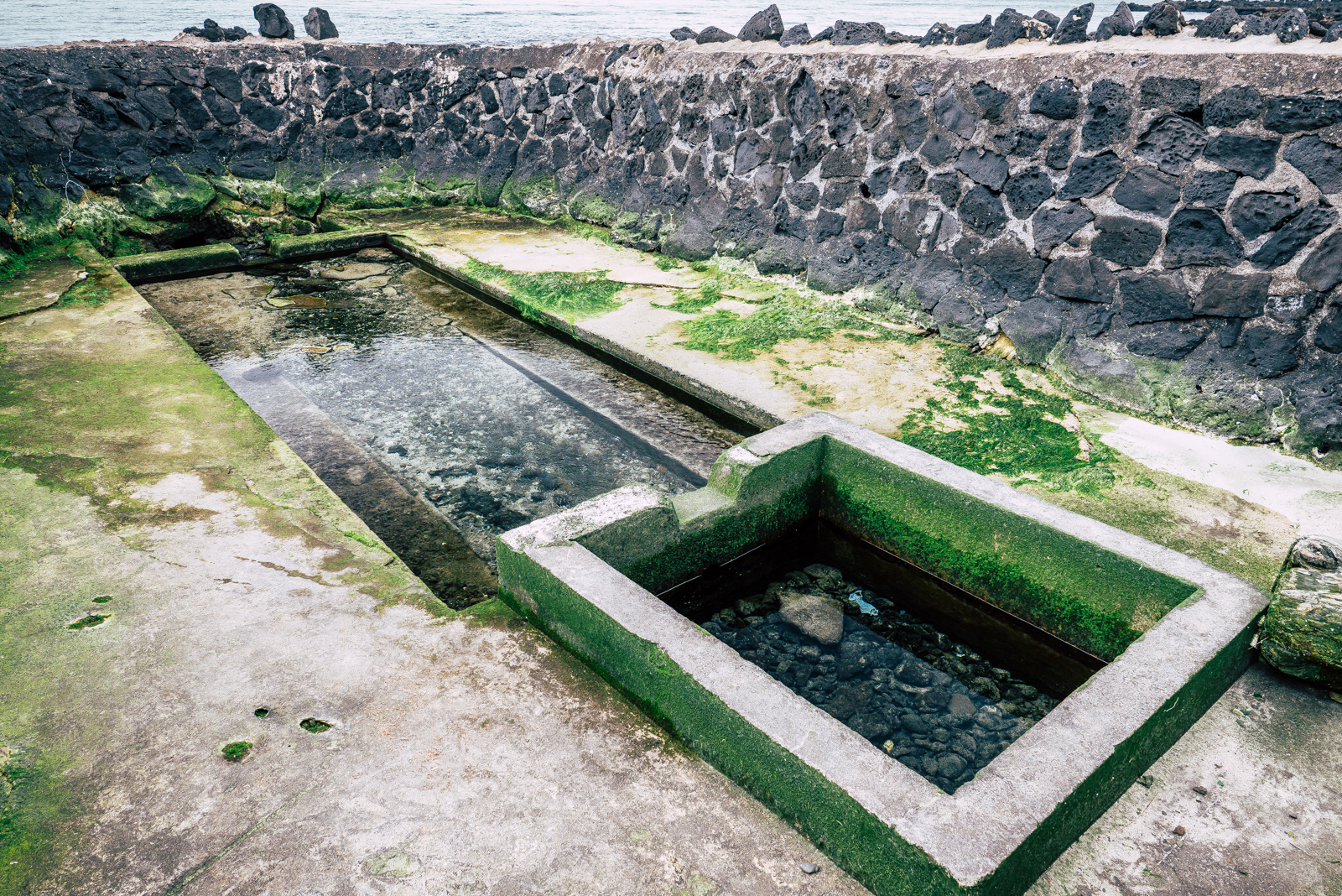 제주 용담해안도로를 본격적으로 걷기 시작하면서 가장 먼저 만난 것은 어영마을의 용천수라 불리는 섯물이다. 섯물은 현무암 돌담을 쌓아 만들어졌는데 제일 위쪽은 먹는 물, 두 번째는 야채 씻는 물, 세 번째 칸은 목욕을 하거나 빨래를 하는 용도로 사용되었다고 한다.