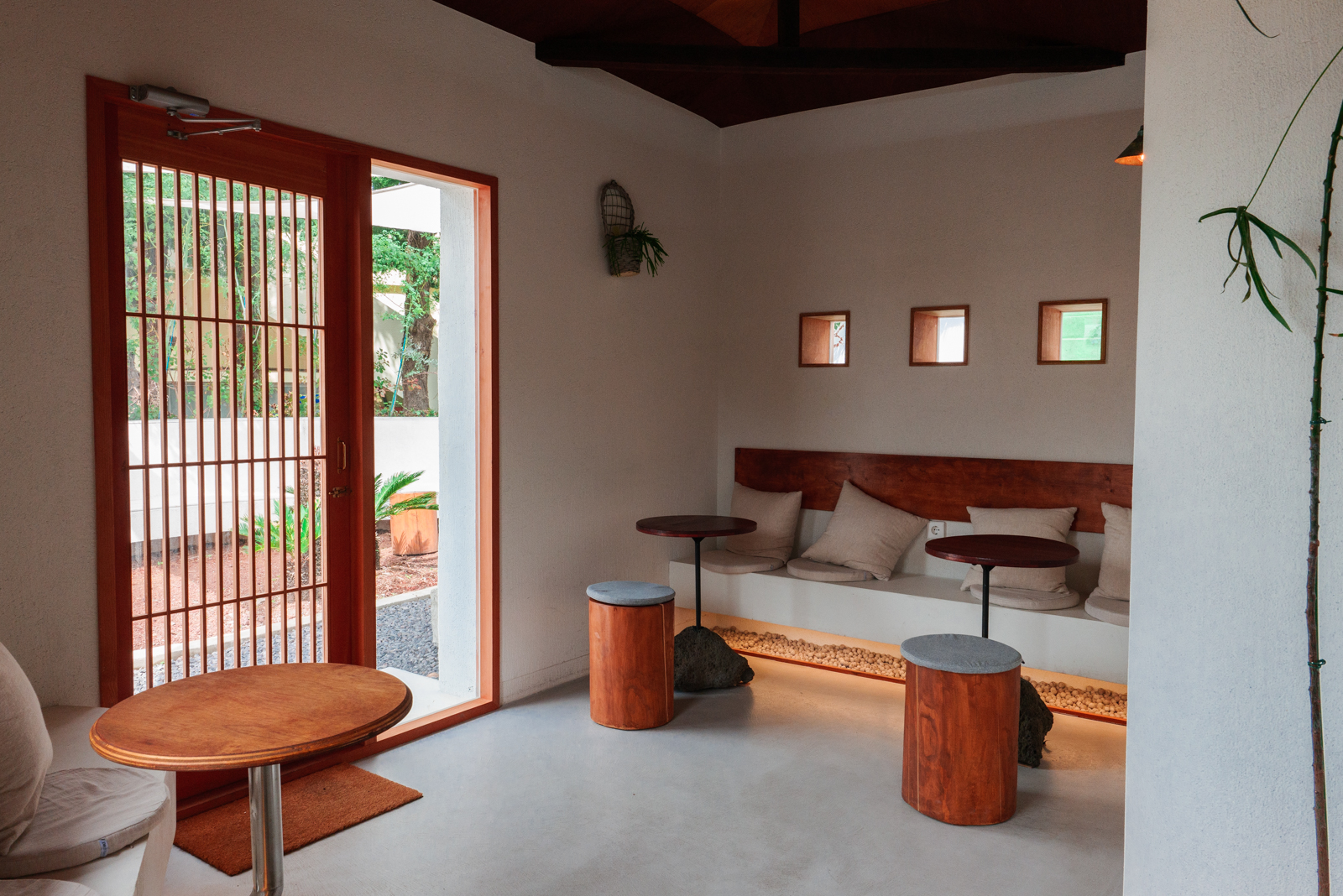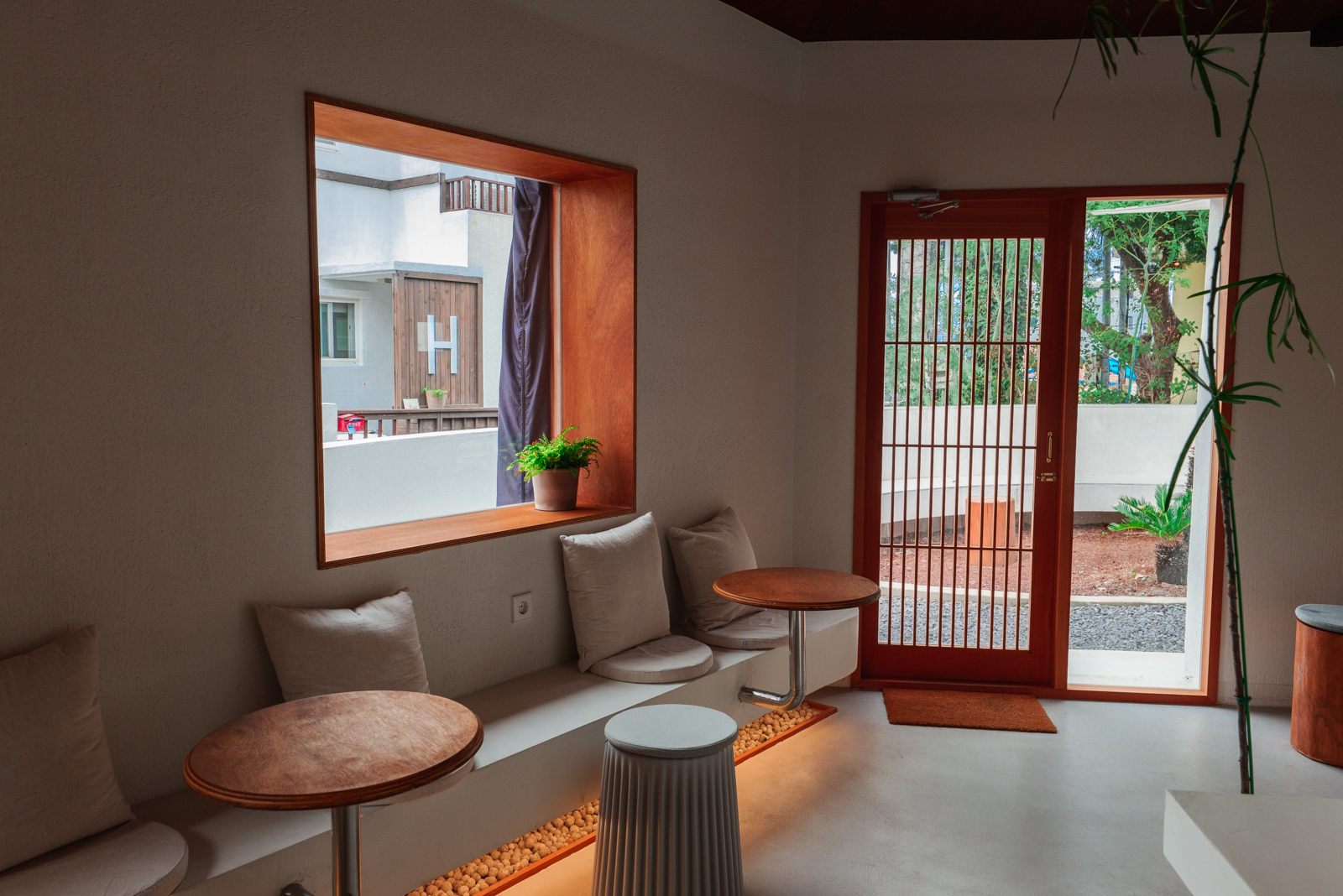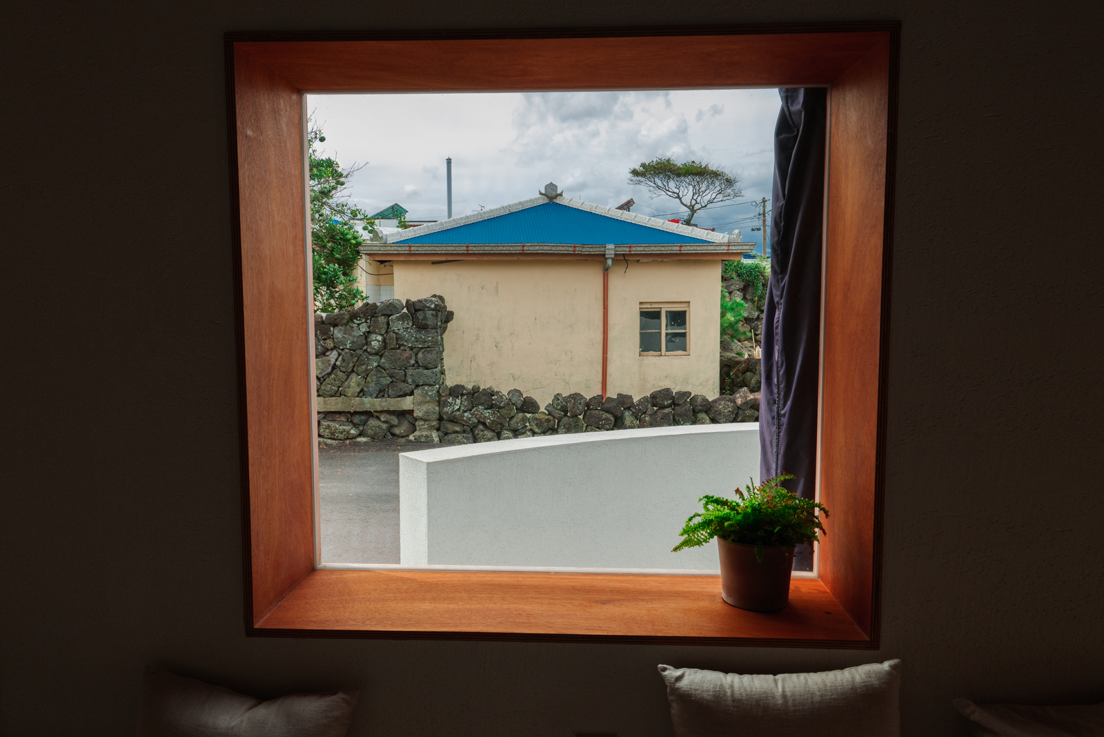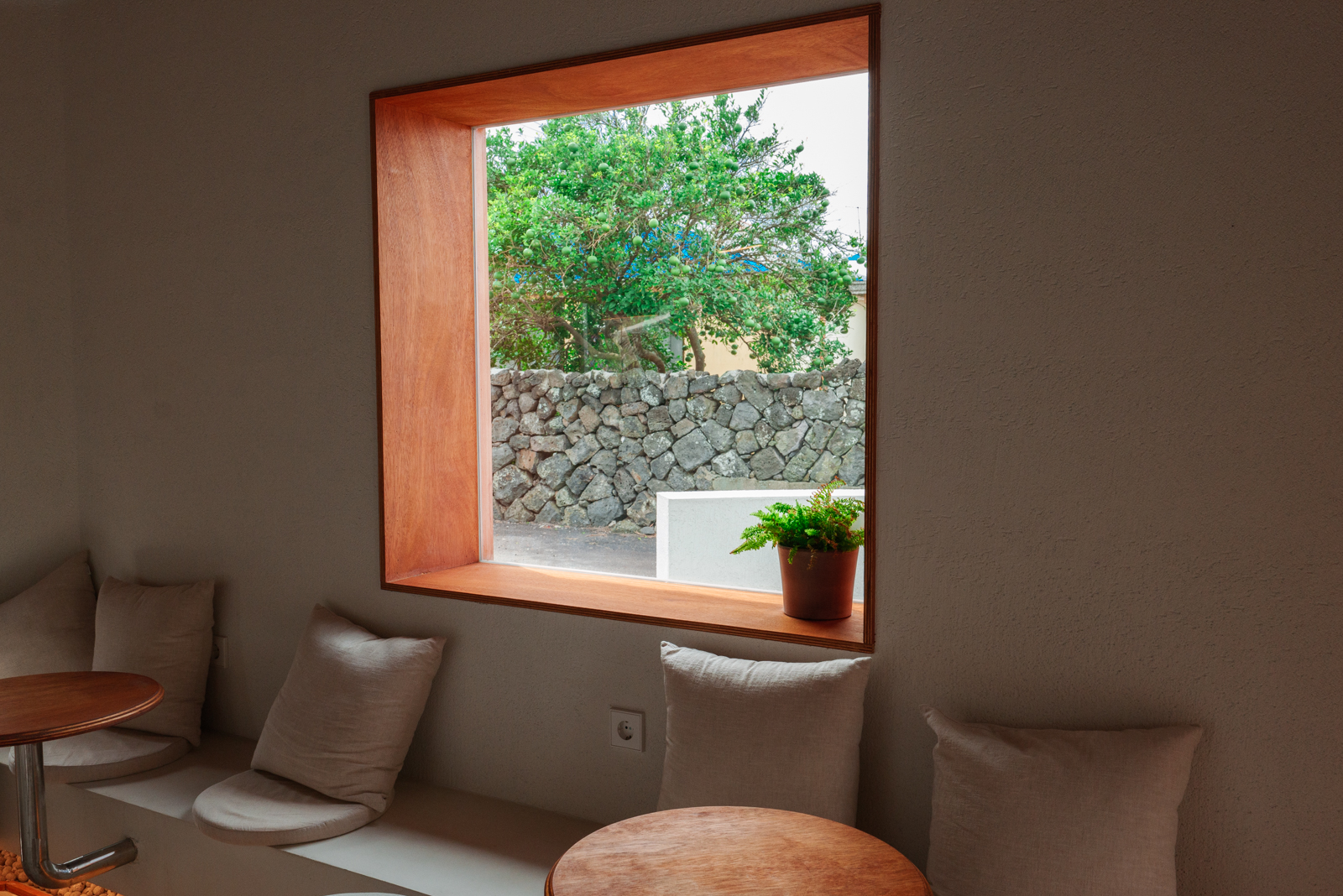 한쪽 공간에는 네모난 창가로 제주시 애월읍 고내리 마을만의 정취를 느껴볼 수 있었는데 평소에는 차가 지나가지 않을 만큼 조용한 동네이기에 한적한 분위기의 애월 카페를 찾는 분들에게 추천하고 싶었다.