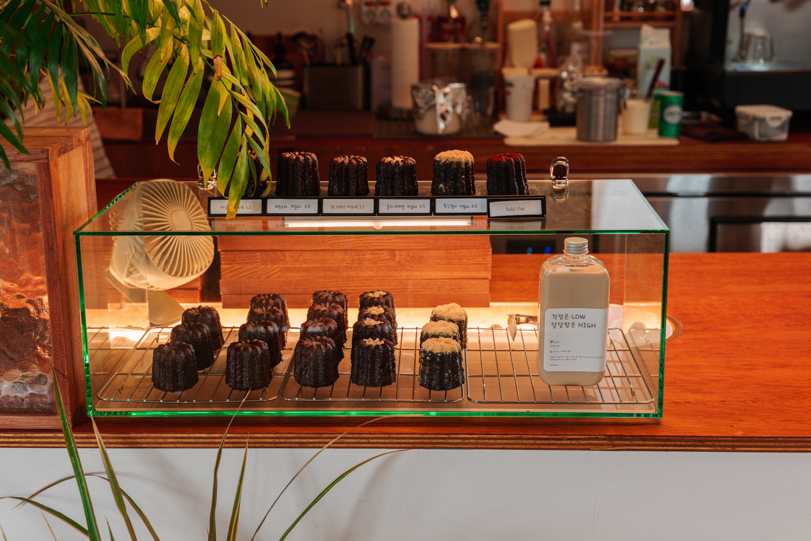 제주 애월 카페 로우하이로 들어가면 카운터 앞에 다양한 종류의 까눌레와 밀크티가 눈길을 끌었다. 까눌레 종류는 바닐라, 얼그레이, 제주녹차, 솔티카라멜, 바스크로 총 다섯 가지가 있었으며 300ml 보틀에 담긴 로얄밀크티는 6,500원이었다.