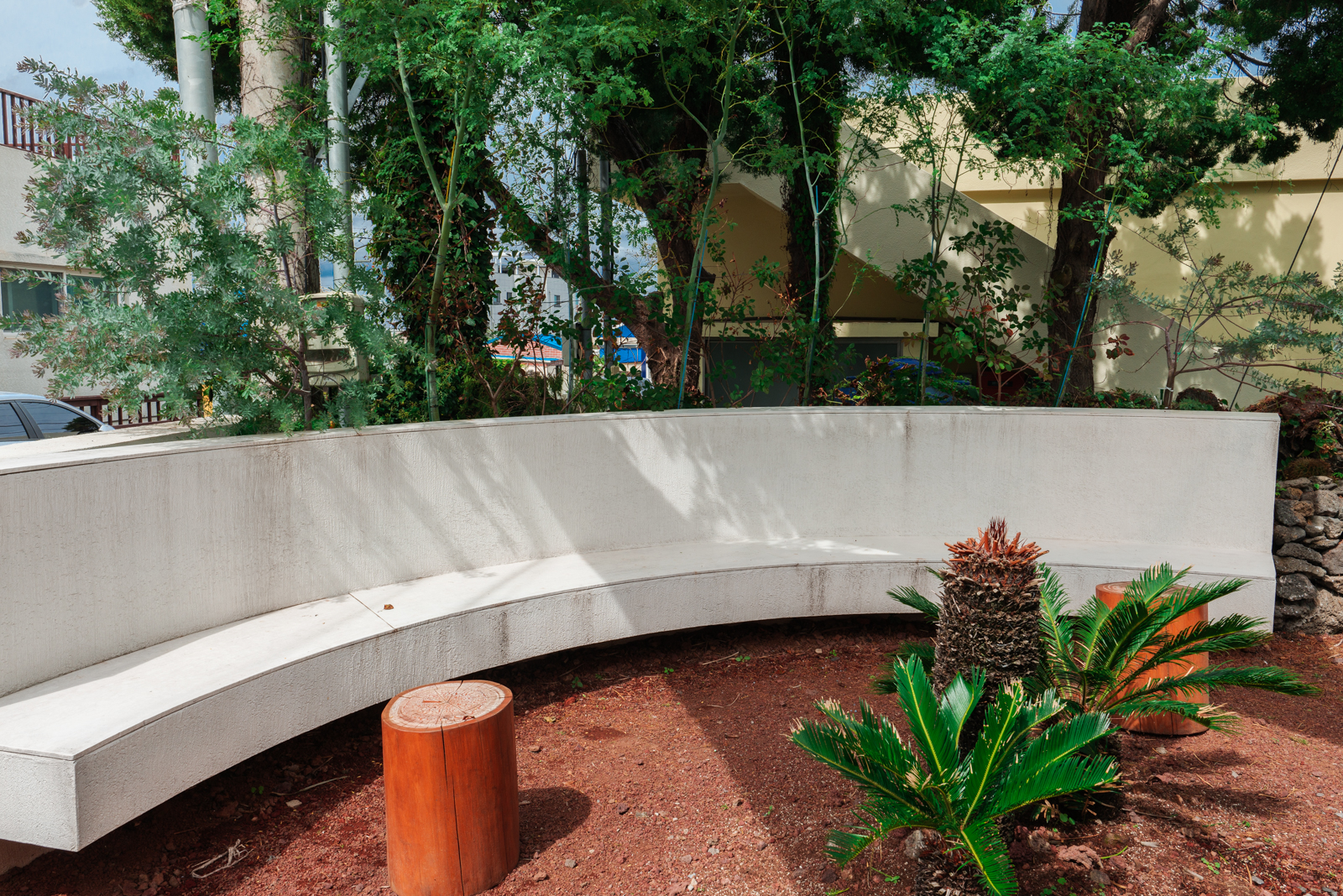 화장실이 위치한 야외 공간에는 초록색 나무와 자그만한 야자수 앞에 나란히 앉을 수 있는 테이블과 의자가 설치되어 있었으며 이것 또한 포토존으로 활용할 수 있었다.