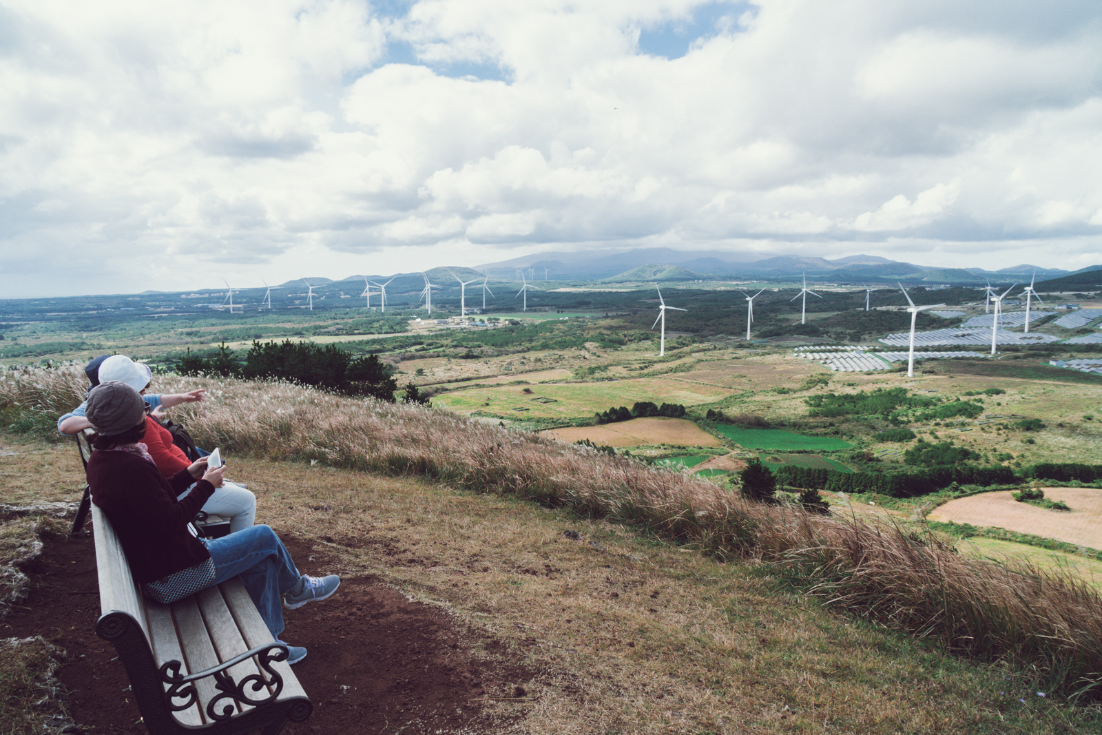 제주도 오름 추천 제주 따라비오름 입구에서 사진에 보이는 곳까지 걷는 데 걸리는 소요시간은 대략 40분 정도다. 오름 정상 언덕길을 따라 올라가면 탁 트인 전경 앞에 의자가 마련되어 있었고 풍력발전기와 주변 오름 풍경이 보이는 등 경치가 끝내줬다.