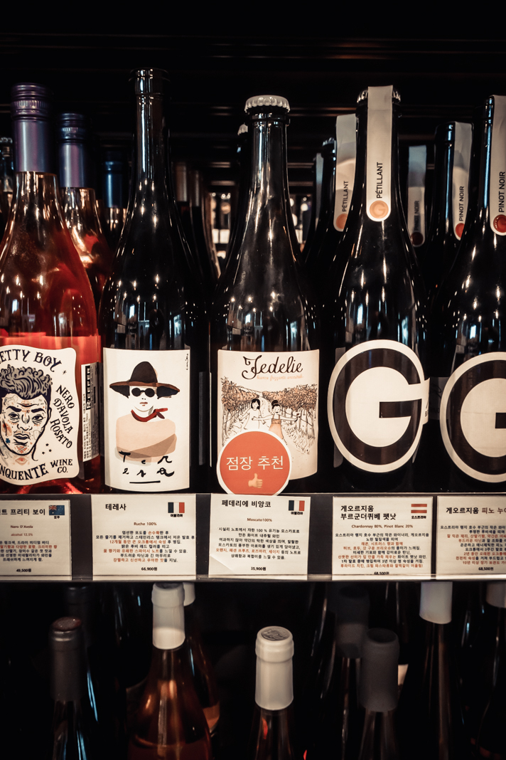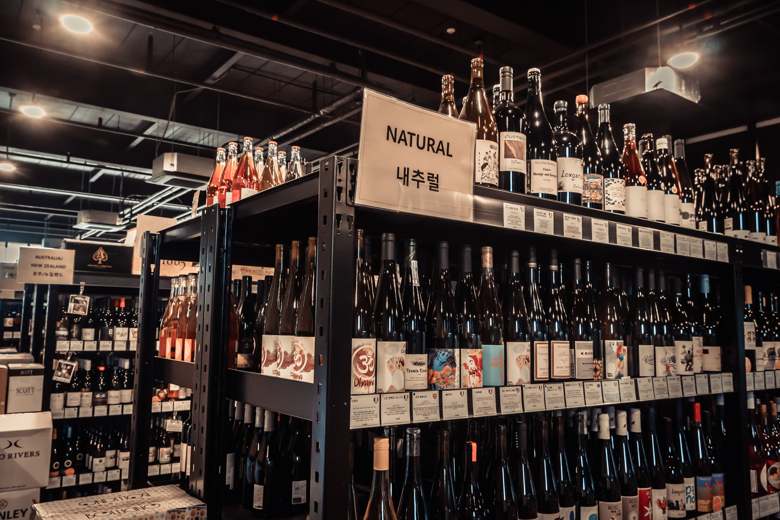 제주 와인샵 와인창고 본점 첫 번째 진열장에는 내츄럴와인 코너로 구성되어 있었다. 내츄럴와인이란 일반 와인과 다르게 유기농 포도로 사람의 손길을 최소화시켜 만들어내는데 화학 첨가물이 들어가지 않는다는 점이 가장 큰 특징이라 말할 수 있다.