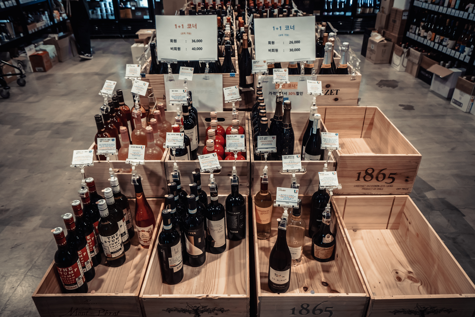 입구 앞에는 상시 이벤트로 와인을 1+1으로 구매할 수 있는 코너가 마련되어 있었다. 회원, 비회원으로 가격대가 형성되어 있었는데 방탄소년단 정국이 마셨던 우마니 론끼 비고르부터 다양한 와인을 보다 저렴한 금액으로 살 수 있다는 점에서 메리트가 느껴졌다.
