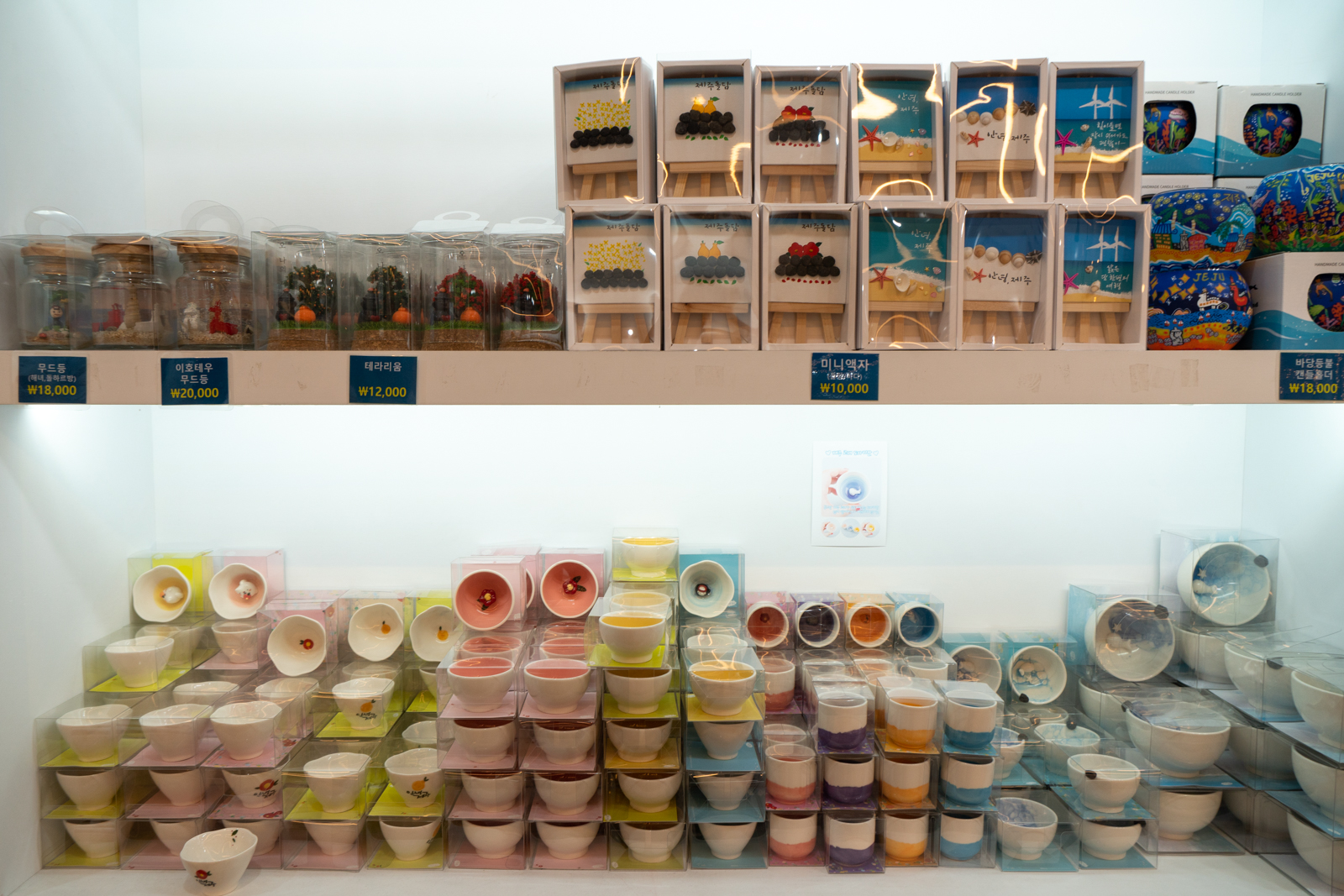 제주 서귀포 소품샵에는 한쪽 공간에 머그잔, 소주잔, 고블렛잔, 와인잔 등 유리와 도자기로 제작된 기념품도 있다. 감귤, 꽃, 한라산, 돌하르방, 해녀를 캐릭터로 그려 담아낸 디자인이 무척 예뻤는데 크기별로 다양하게 갖추고 있어 취향에 따라 고를 수 있다.