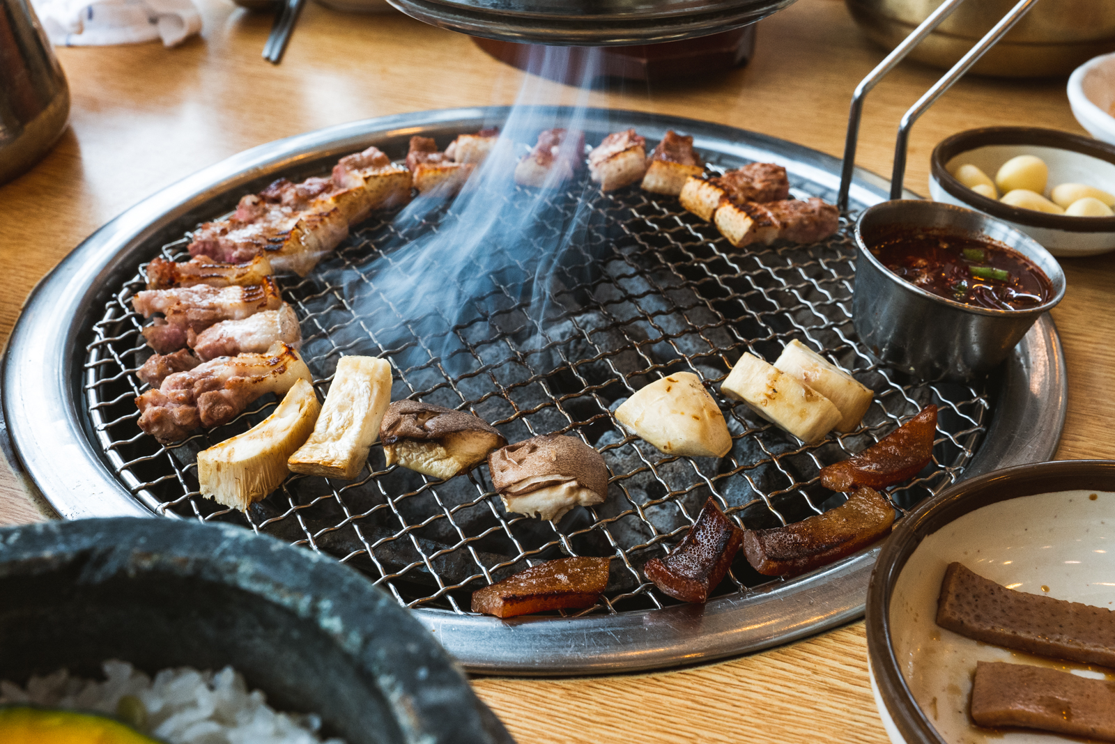 흑돼지 고기가 익으면 가위로 먹기 좋게 자른 후 안쪽까지 더 익혀주면 된다. 고기와 함께 버섯, 돼지껍데기를 익혀 쌈밥으로 먹을 수 있으며 멜젓 또한 나오기에 제주도 향토음식을 제대로 느낄 수 있다.