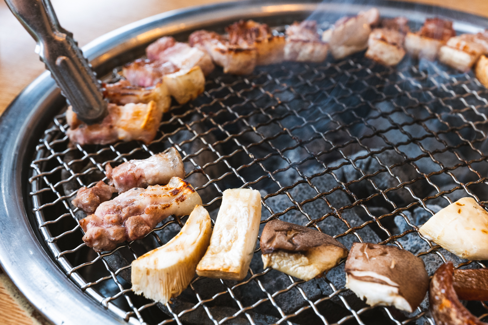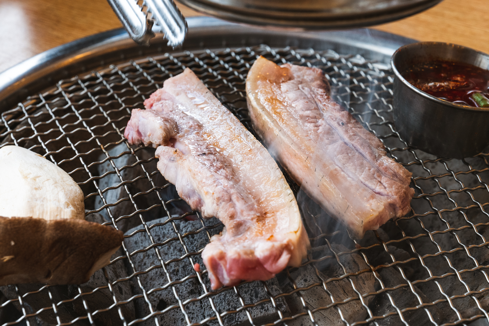 숯불이 올라오면 불판에 흑돼지 고기 두 점을 올려 앞쪽, 뒤쪽, 옆면을 익혀주면 된다. 숯불의 화력으로 금방 익혀서 빠르게 먹을 수 있고 제주도에서 인기가 많은 식당답게 고기 회전률 또한 빨라 무척 신선했다.