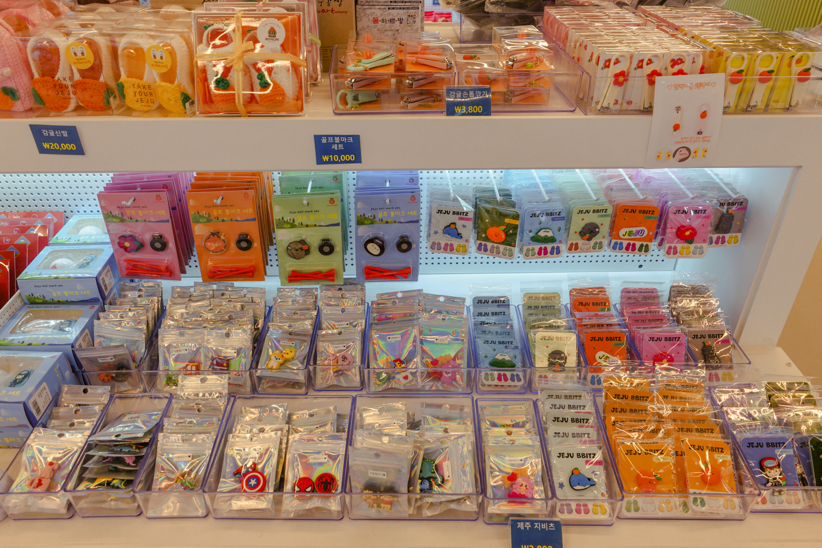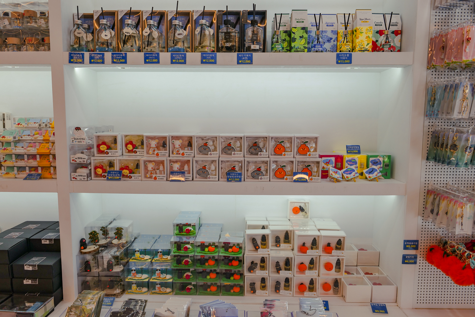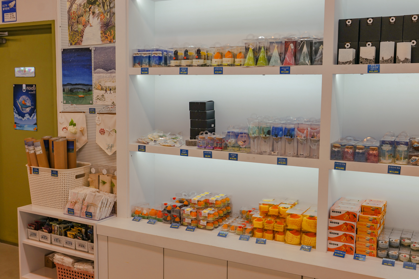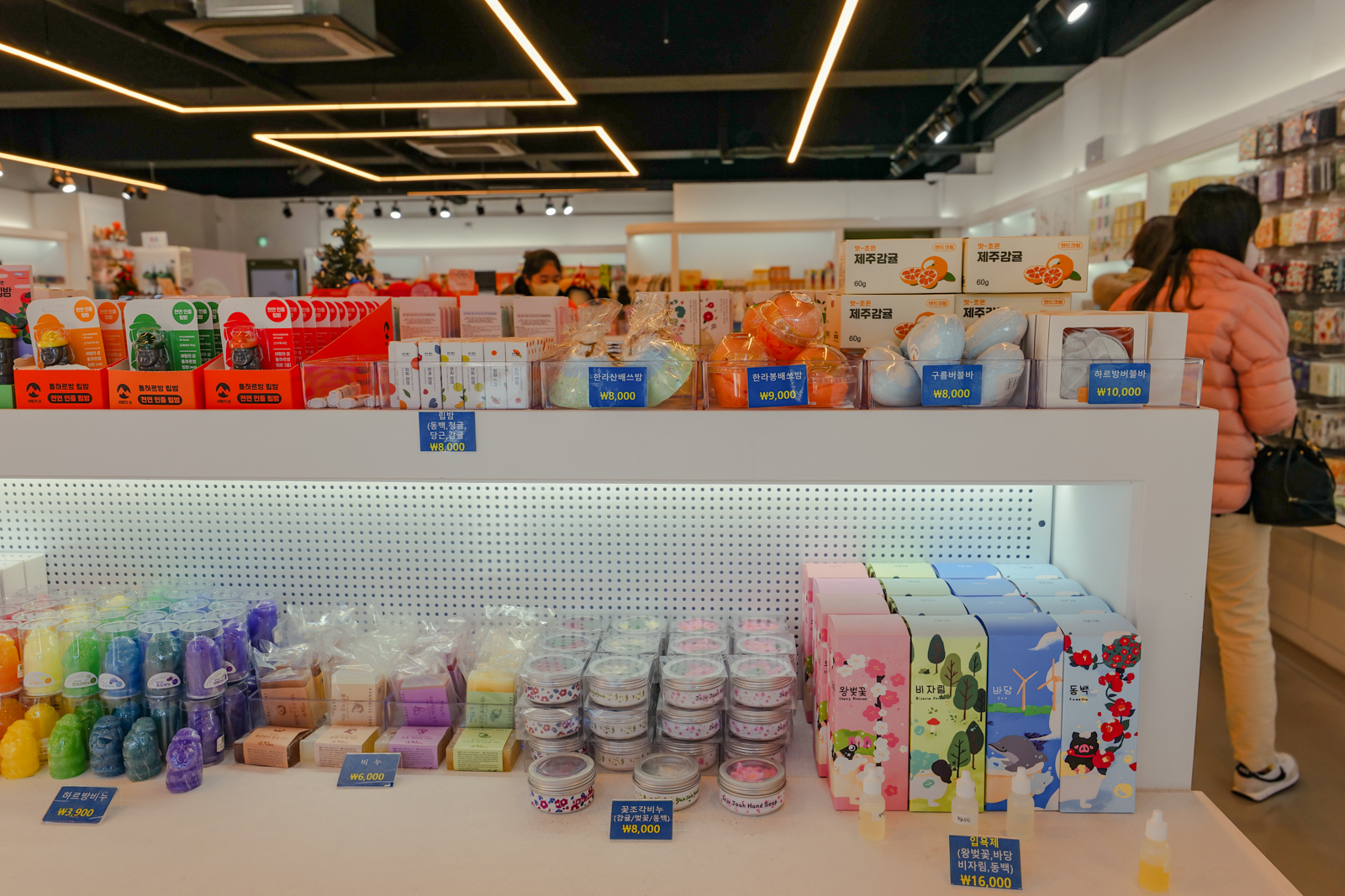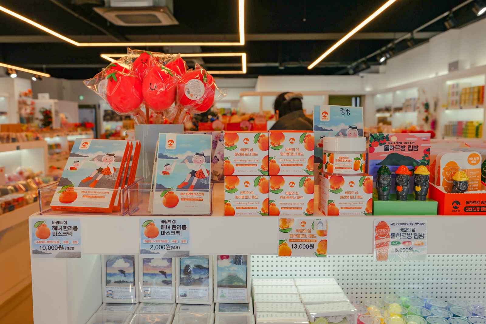 제주도 여행객에게 인기가 많은 명소인 중문관광단지 근처에 위치한 서귀포 소품샵답게 입구 쪽 진열장에는 한라봉 마스크팩, 비누, 입욕제가 있어 여행 중 숙소에 머물면서 사용할 만한 상품이 있었다.