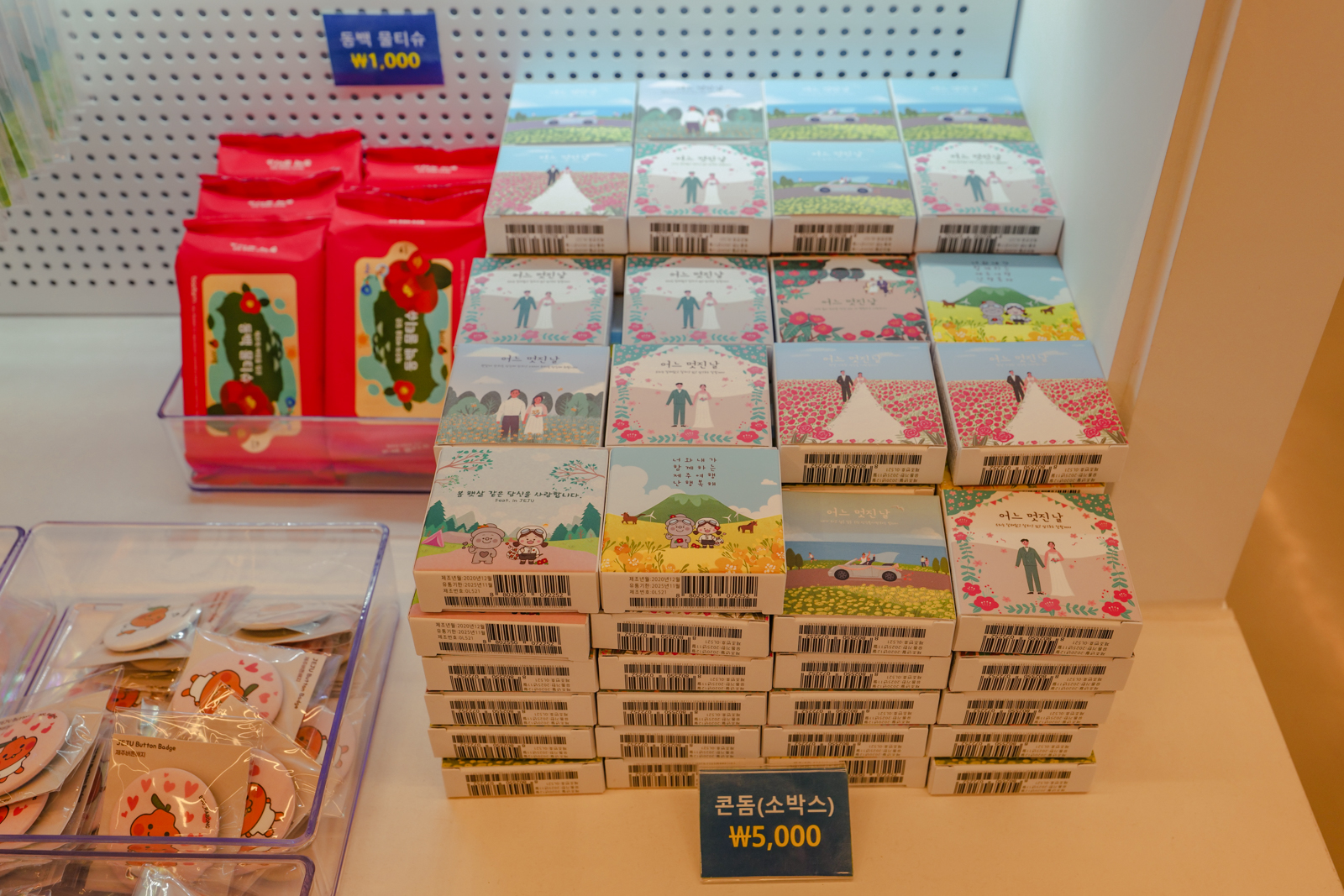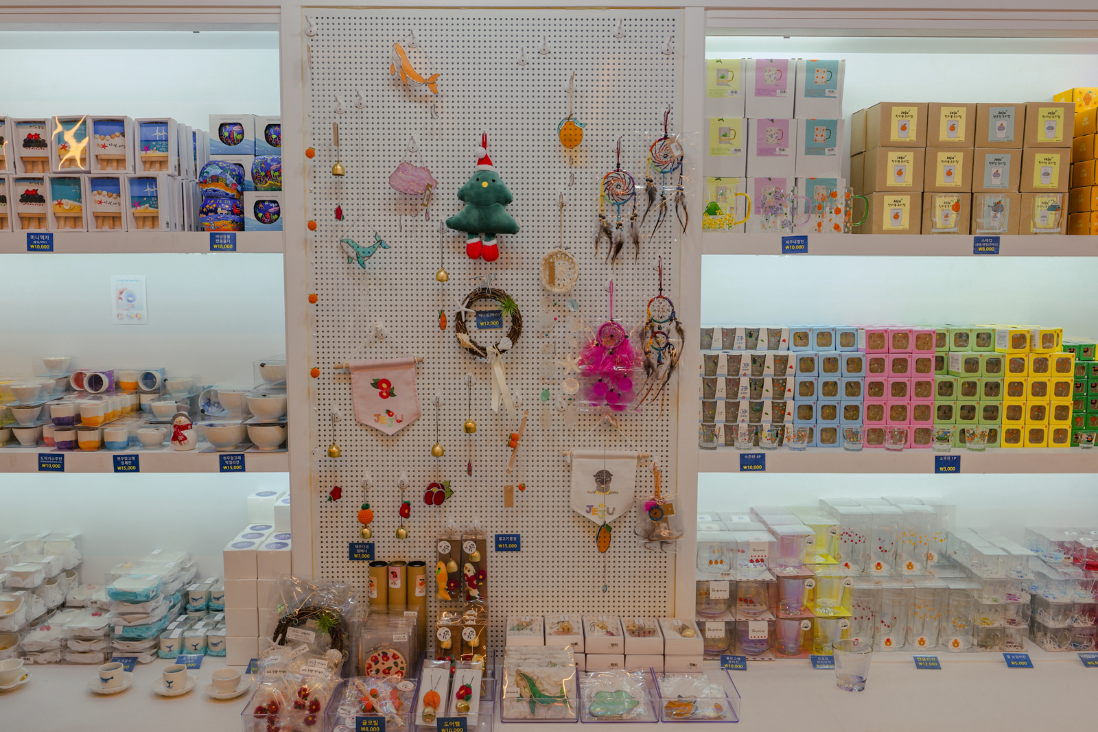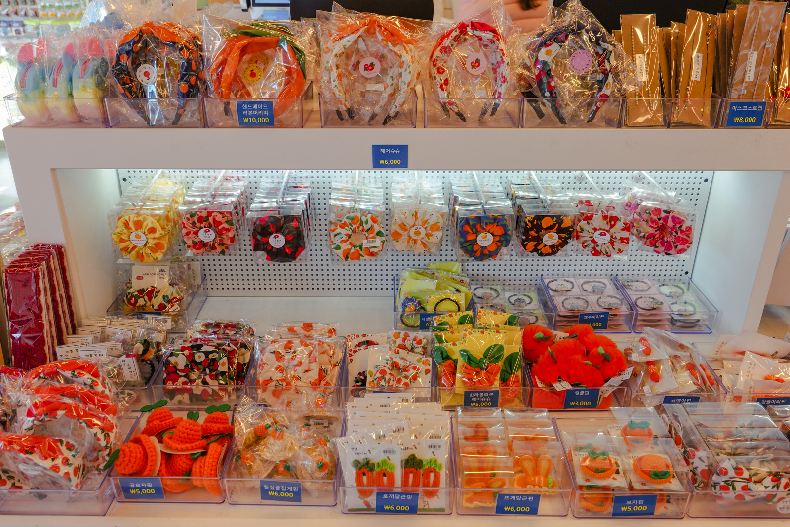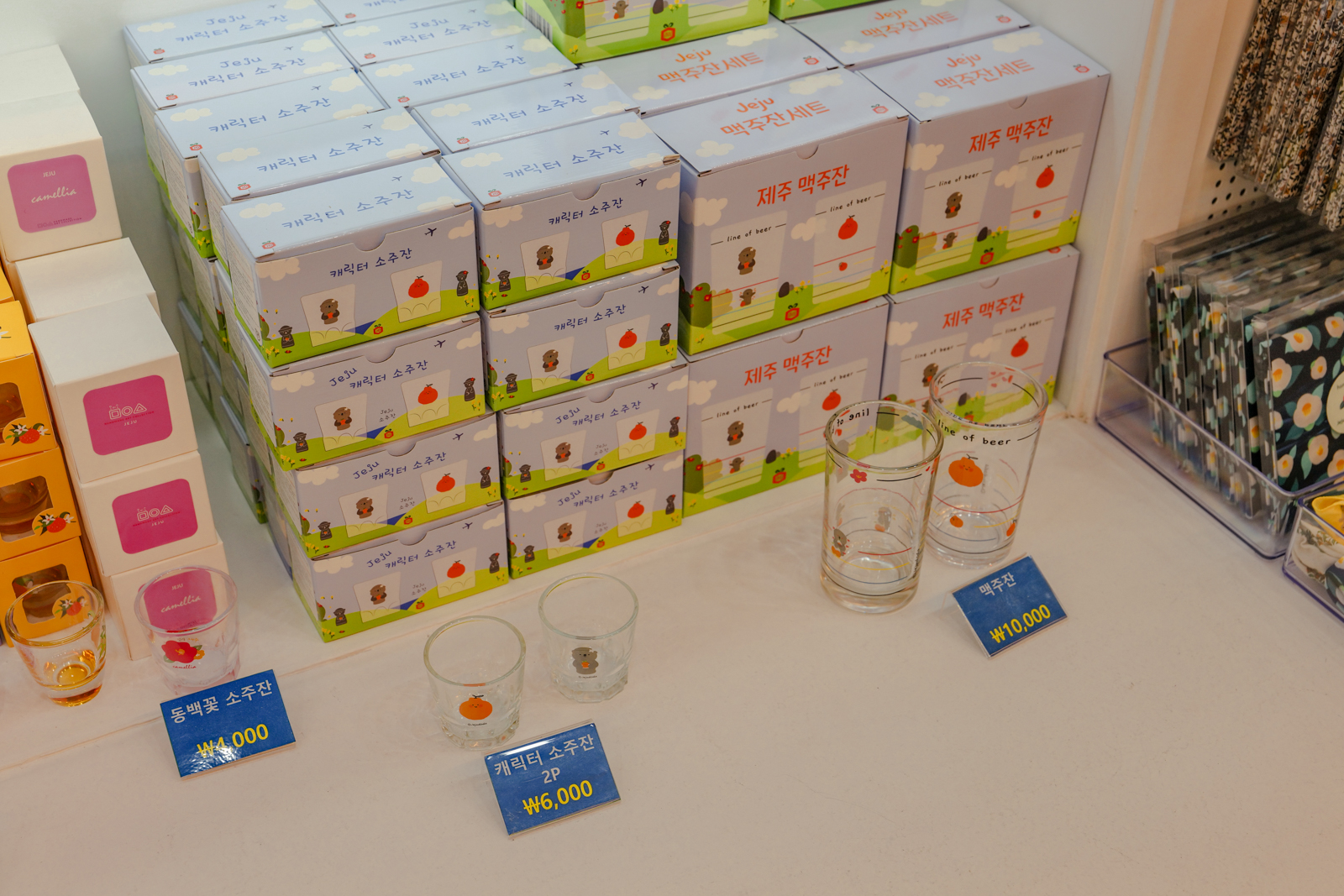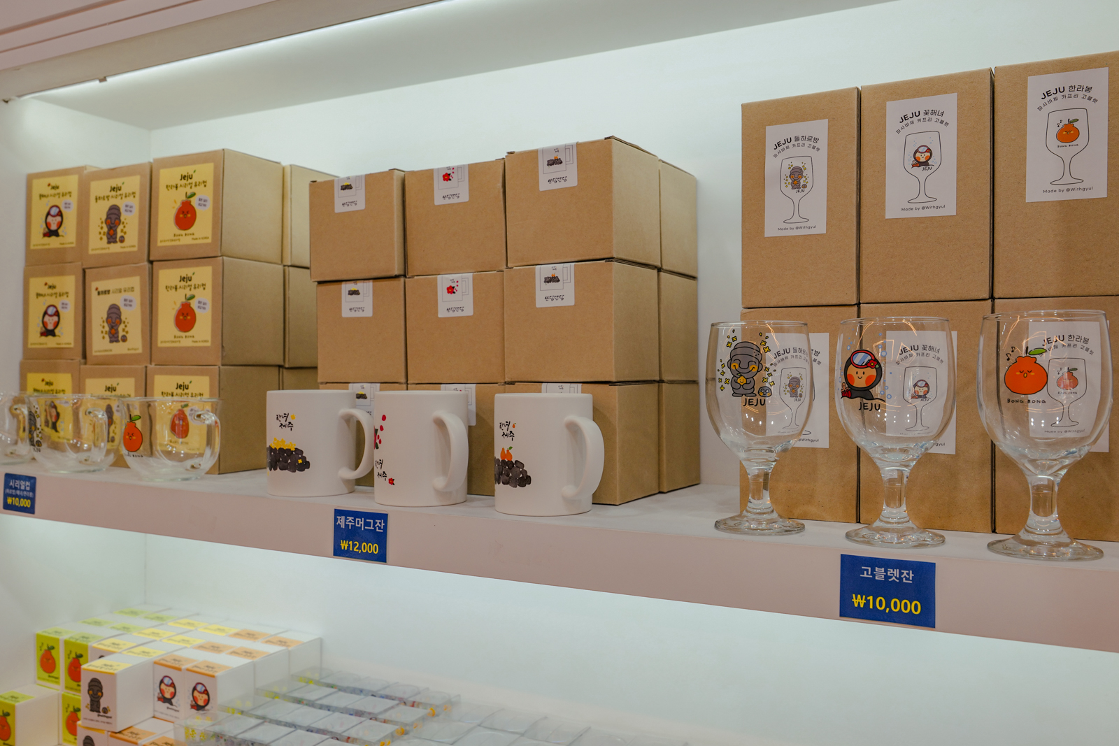 제주도 여행객에게 인기가 많은 명소인 중문관광단지 근처에 위치한 서귀포 소품샵답게 입구 쪽 진열장에는 한라봉 마스크팩, 비누, 입욕제가 있어 여행 중 숙소에 머물면서 사용할 만한 상품이 있었다.