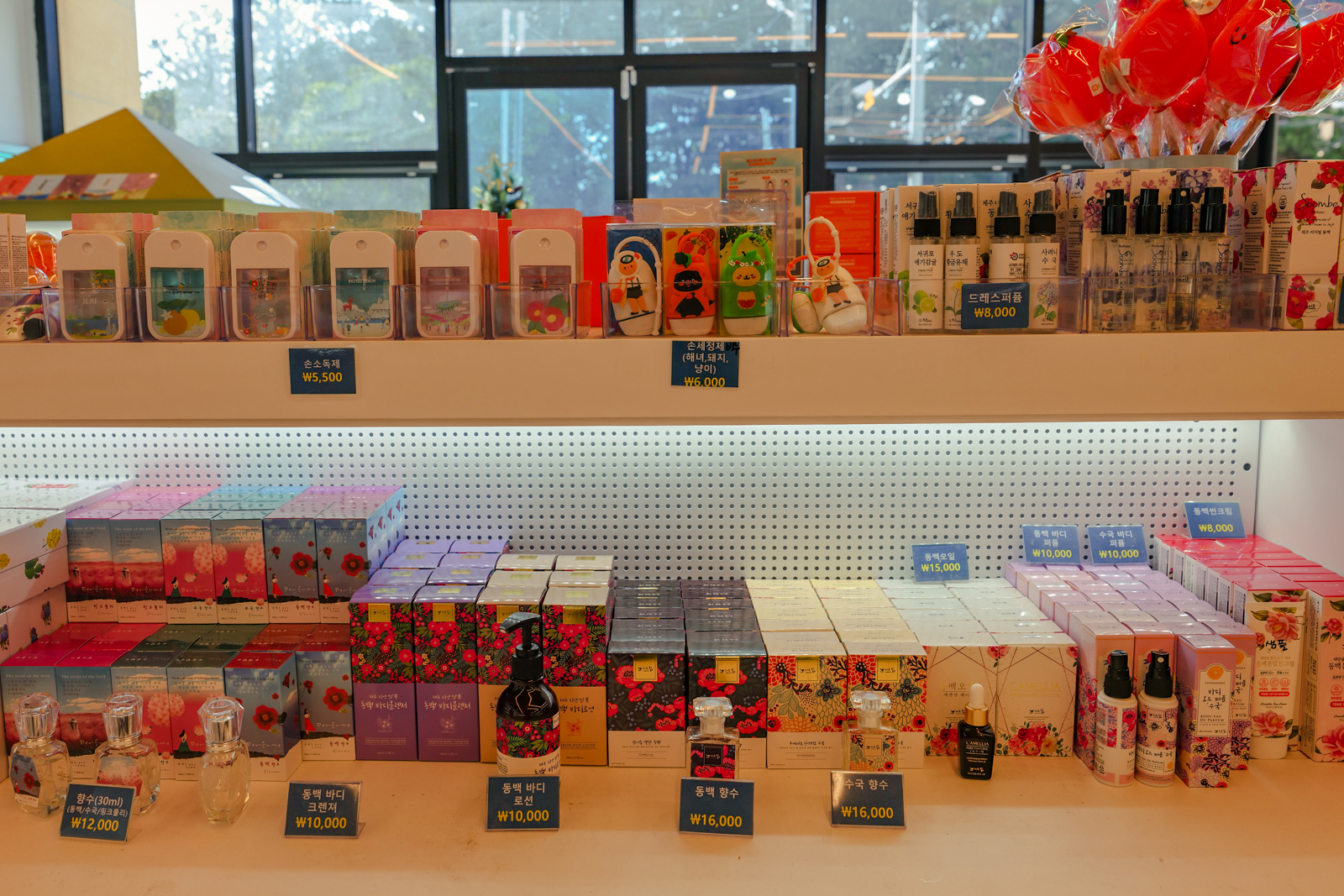 제주도 소품샵 중문 만달에는 동백꽃에서 추출한 오일로 만든 향수, 바디클렌저, 로션 등 뷰티 아이템이 있는데 진열장에 놓인 샘플을 통해 직접 향을 맡아보고 고를 수 있었다.