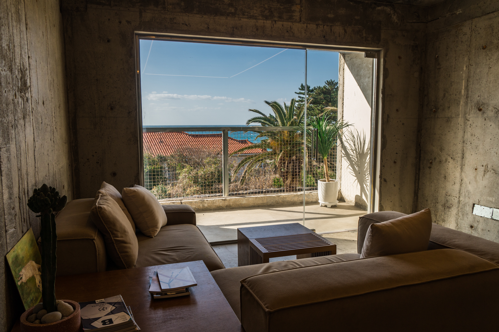 야자수와 제주 애월해안도로 바다가 보이는 창가 자리 앞에 장시간 편하게 머물 수 있는 소파와 테이블이 갖춰져 있었고 여러 명이 앉을 수 있을 만큼 규모도 넓었다.