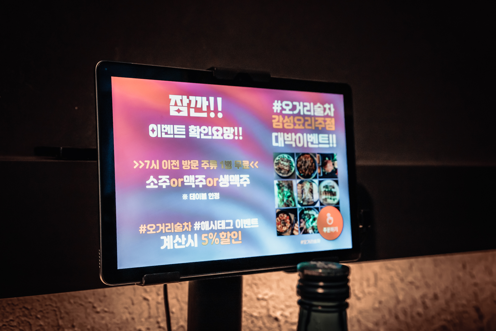 현재 제주 오거리술차에서는 오픈 이벤트로 오후 7시 이전 방문 시 소주, 맥주, 생맥주 중 1병을 무료로 마실 수 있으며 태블릿에 적혀 있는 해시태그를 포함해 인스타그램에 올리면 계산 시 5% 할인 혜택도 주어진다.