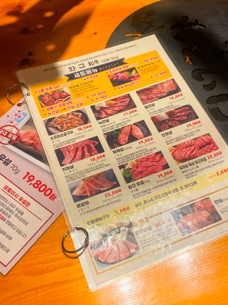 이어 세트메뉴가 나오는데 소고기 업진살, 늑간살, 안창살, 부채살, 꽃갈비살, 등심으로 구성되어 있다. 350g으로 양이 부족할 것 같았지만 막상 구워 먹다 보니 2인분으로 충분한 양이었다. (서비스로 양념갈비살도 주셨다)